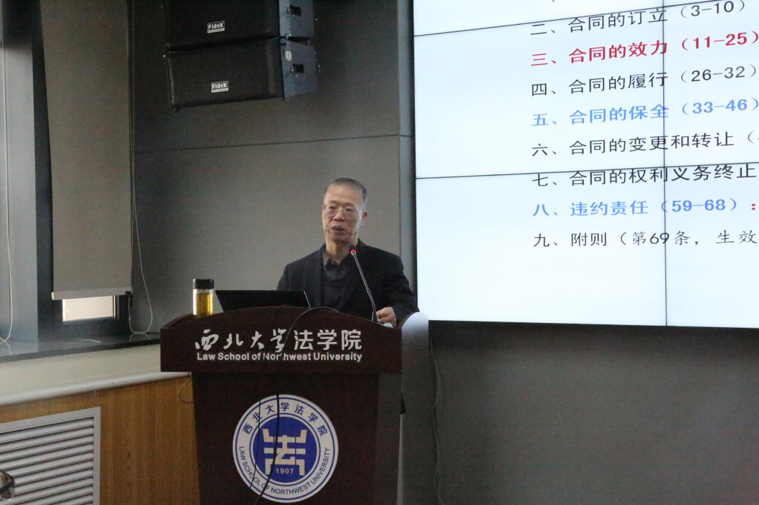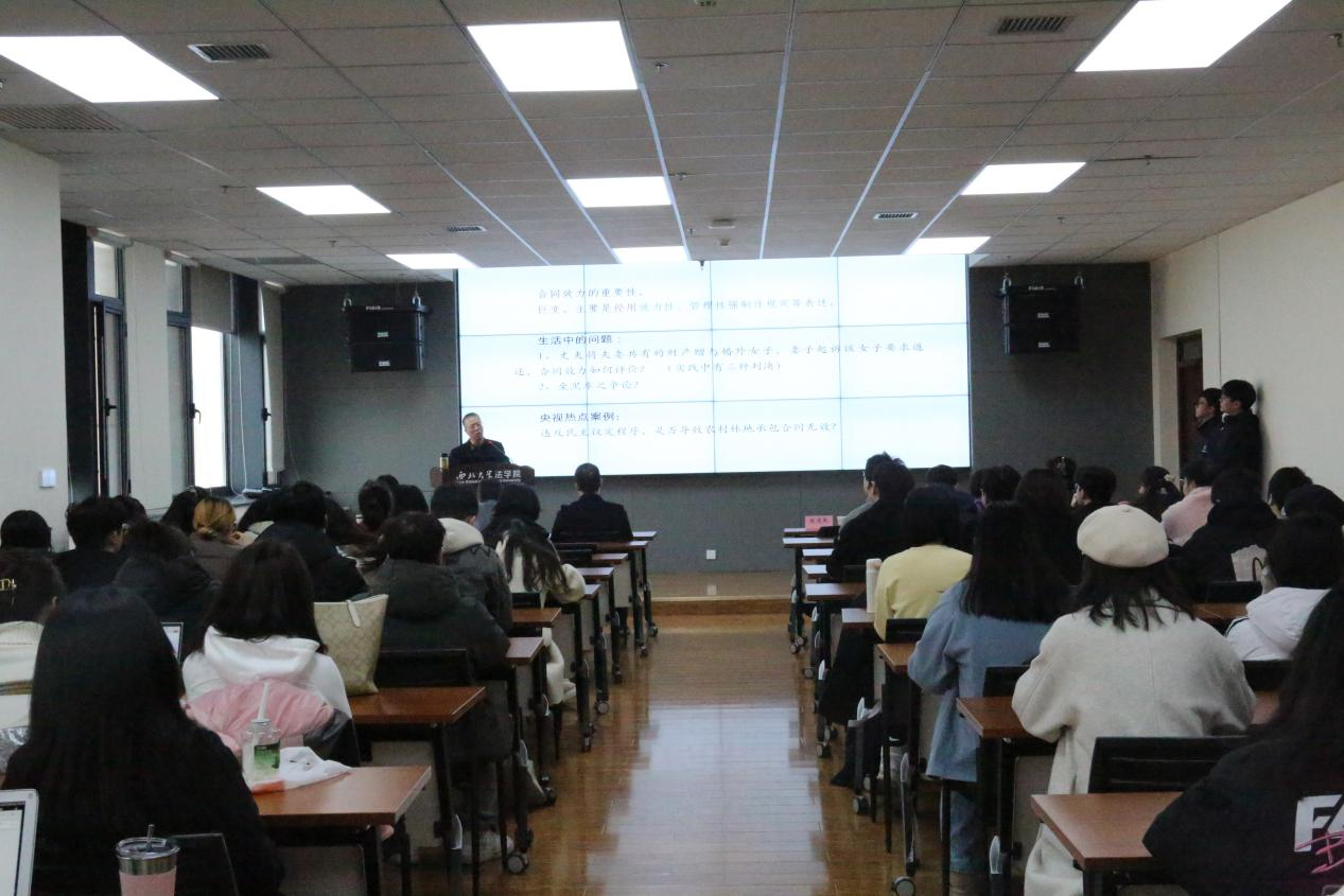 为提高学生对民法典合同编司法解释的理解,使学生全面了解合同效力认定问题的司法实践情况,2025年1月10日,我院在长安校区西学楼0904报告厅成功举办了“民法典合同编解释之‘合同效力问题’”实务专题讲座。陕西省高级人民法院二级高级法官赵建民法官受邀,以“民法典合同编解释之‘合同效力问题’”为题,为我院学生做了一场精彩的实务讲座。学院副院长崔玲玲老师、民商法学教研部教师傅强老师、刘桢老师及近百名本科生、硕士生参加,讲座由学院院长王思锋教授主持。