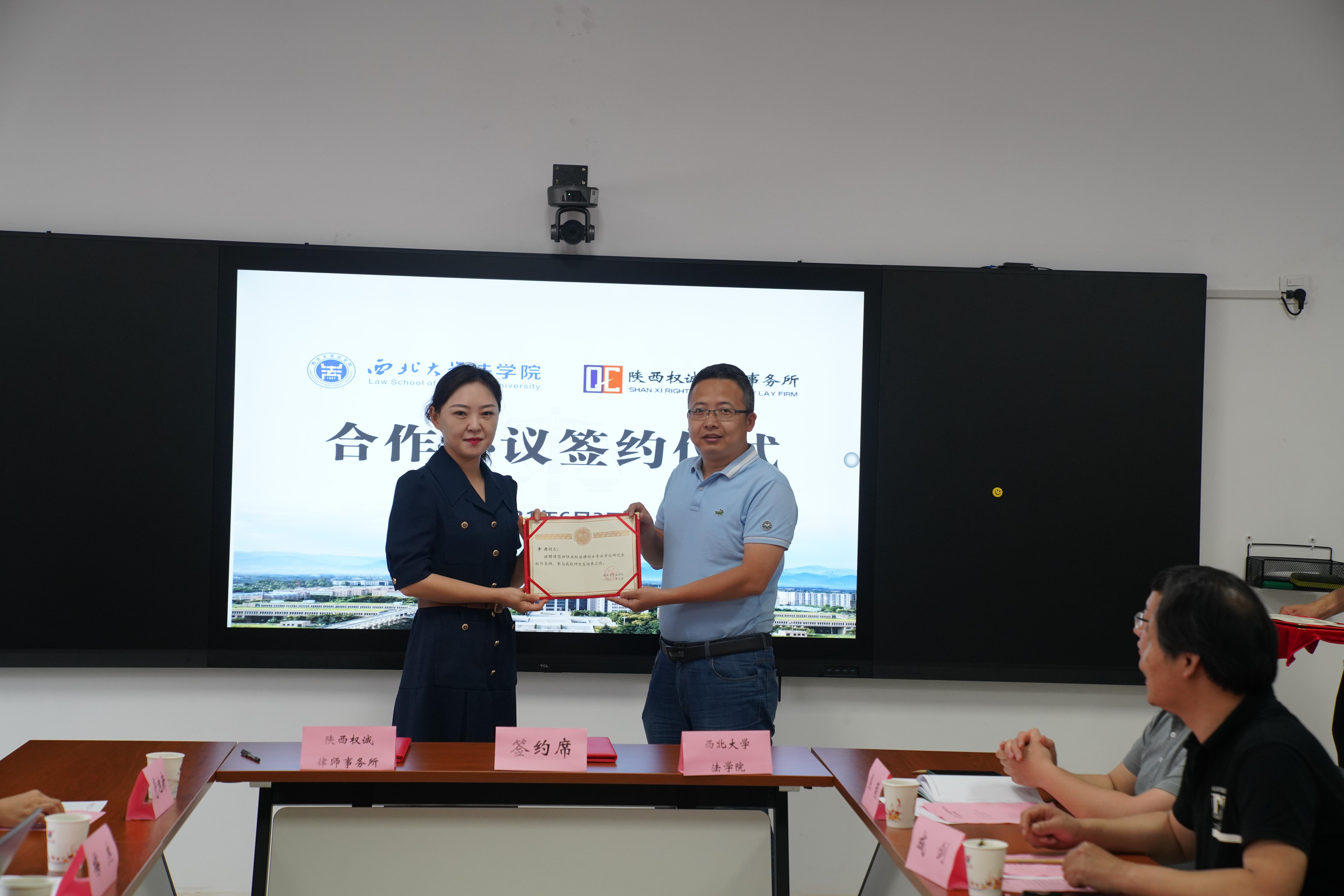 王思锋院长与李丹主任代表双方单位签署了合作协议。学院环境与资源保护法学教研部主任王社坤教授和陕西权诚律师事务所副主任张宝刚律师共同为实践教学基地揭牌。学院副院长代水平向陕西权诚律师事务所主任李丹、副主任张宝刚和高级合伙人梅杰颁发了法律硕士实务导师聘书。梅杰律师代表法律硕士实务导师作了发言,表示未来一定按照学院的要求,参与服务于学院研究生培养工作。