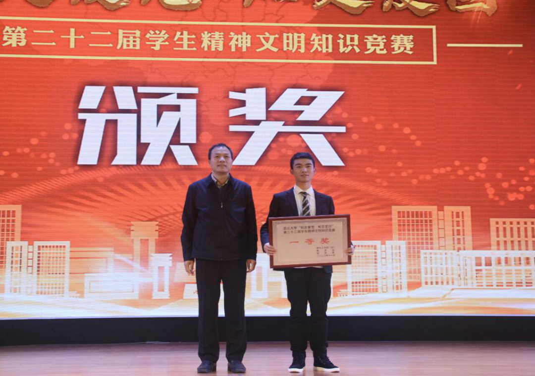 由洪子威选手代表我院上台领奖,由校领导为我院颁发奖状并合影留念。