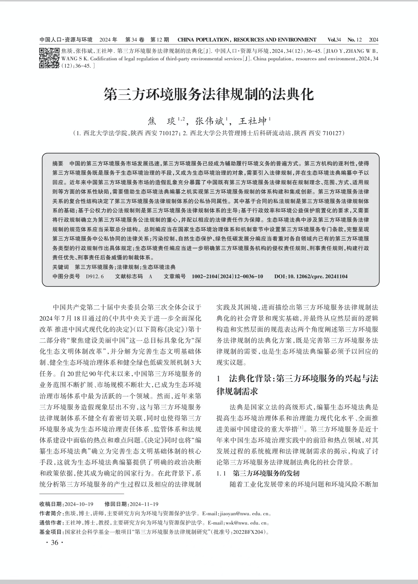 近日,我院环境法研究团队青年教师焦琰博士、硕士研究生张伟斌、王社坤教授(通讯作者)的论文《第三方环境服务法律规制的法典化》在CSSCI来源期刊《中国人口·资源与环境》2024年第12期发表。